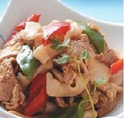 3.葱、姜放入锅器中,加入b强火爆香2分钟,捞出葱、姜,加入肉片中拌匀加盖,强火煮熟取出,加入百合拌匀,盛入盘中即可。