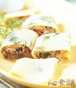 3.将作法3的内馅,均匀放置于作法1的饼皮中,由内而外慢慢捲起即可。