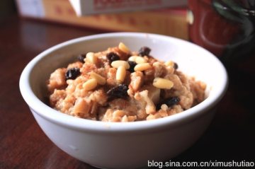 5、没有苹果酱的,可以用一个苹果代替。放了苹果的粥,口味酸酸甜甜的,很好吃,加上肉桂,很有点苹果派的感觉。不喜欢肉桂味道的,可以不放。口味特别甜的,可以多加1大勺黄糖(brown sugar)。我是很喜欢肉桂口味的,所以盛出来之后又撒了一点点,然后点缀了几颗葡萄干和松子~大家也可以随意配上自己喜欢的新鲜水果或者水果干,还有果仁~