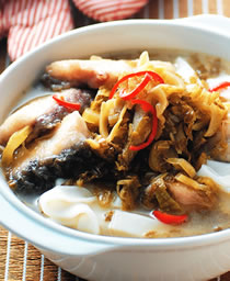 4.重新加热作法3的锅子,放入作法1的酸菜段,以小火炒约3分钟后,再加入鱼煨汤,以小火煮3分钟,接着放入作法3的鱼肉片与所有调味料一起拌匀,煮约5分钟。
