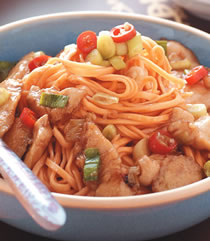 小里肌肉片120公克,蒜末10公克,洋葱40公克,红甜椒片40公克,青甜椒片30公克,高汤50㏄,面片170公克,甜面酱1/2小匙,酱油1小匙,砂糖1/4小匙,盐少许