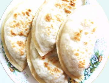 3、制做:面揉成长条,切成比水饺大点的剂子,擀成薄皮。馅铺在皮的一半,另一半皮 折上,用小碗口滚动压实;