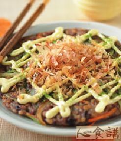5.热平底锅后加入适量橄榄油,倒入作法3煎饼面煳以中火煎至定型后翻面,煎至熟透且两面微焦,起锅盛盘后挤上美奶滋,再撒上适量柴鱼粉和海苔粉即可。