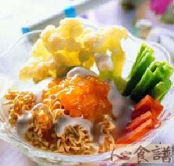 (1)将泡面面条压碎,白花椰菜、四季豆、红萝卜洗净,用热水川烫沖凉备用。