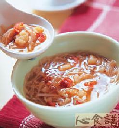 5.取作法1中适量的红面线羹,食用前再依个人喜好,放入作法3的麻辣油及作法4的菜脯末即可。