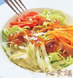3取一盘,将作法1的波菜面条置于盘中,再于面条表层排放作法2的材料、淋上青蔬麻酱汁即可。