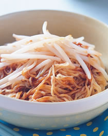 4.用开水将绿豆芽略烫一下,捞起沥干后置于面上。