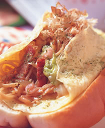 6.大亨堡略烤上色后,于中间面包部份涂上奶油,依序夹入作法5的蛋皮,再将作法4的烧面平舖于蛋皮上,淋上适量作法2的酱汁,撒上柴鱼片、青海苔粉即可。