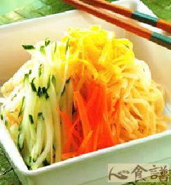 5.把作法3的面盛盘,放上小黄瓜丝、红萝卜丝,最后再淋上作法4的酱汁拌匀即可。