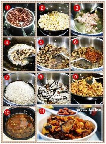 3. 把预先浸过的糯米加入,再加入调味料炒匀..(图7- 图9)