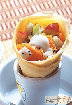 4.将可丽饼在2/3处对折,两侧回折交叠,卷成圆锥状,再将所有水果丁填入中空部分,淋上优格与少许蜂蜜即可。