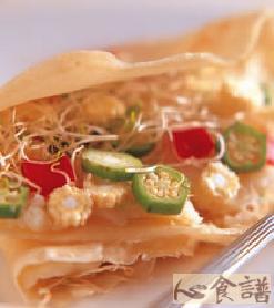 饼皮1份,秋葵5根,苜蓿芽300公克,玉米荀100公克,红椒1个,酱料:1/2颗,马铃薯2粒,白胡椒少许,盐少许