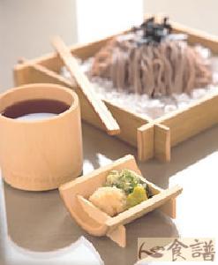 荞麦面100公克,姜泥1小匙,葱末1小匙,芥末1小匙,海苔丝少许,荞麦面酱汁1/2杯