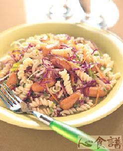 螺旋义大利面100公克,小香肠50公克,紫生菜少许,洋葱少许,生菜叶少许,红萝卜少许,义大利油醋汁3大匙