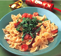 5. 捞起作法3的蝴蝶面放入作法4中的酱汁锅中,并加入起司粉拌炒1∼2分钟后,即可起锅装盘,放上九层塔末即可。