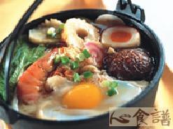 鲜虾2尾,透抽60公克,蛤蜊4颗,鱼板1片,金针菇10公克,洋葱1公克,葱段少许,鸡蛋1个,乌龙面150公克,高汤350㏄,盐1/2茶匙