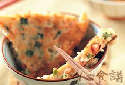 2.将上项混合均匀,平底锅热匀,倒入沙拉油,再倒入混合好的面煳以中小火两面煎金黄至熟,再切块。