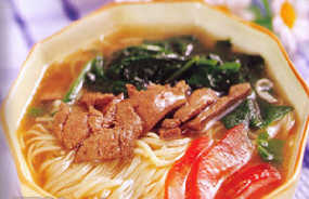 主料:面条250克,番茄100克,菠菜50克,猪肝75克,花生油10克,花椒,精盐,香油,鸡汤,酱油,姜丝,葱丝各适量。