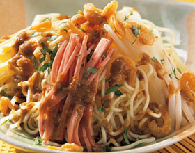 主料:面条(标准粉)100克,火腿30克,黄瓜10克,番茄10克,裙带菜(干)10克,