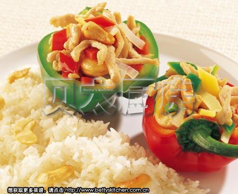 起锅盛在去籽、蒂的1/2只青菜椒和红菜椒中,配合新鲜蒸熟的米饭食用。