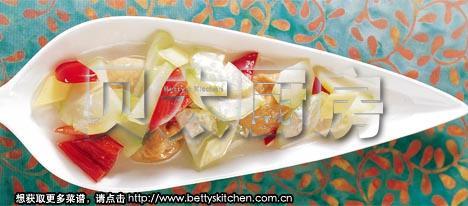佛手瓜用清水洗去表面泥土,削去瓜皮,再对半剖开,取出瓜核,切成0.5cm厚的薄片。红菜椒洗净去除内籽,切成3cm大小的三角片。姜削去外皮,切成菱形片。