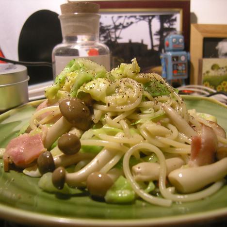 洋白菜半只,蟹味菇半盒,培根两三片,奶油半块,意大利面,盐少许,味好美“磨厨”黑胡椒