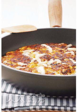 4、最后将余下的古老也奶酪丝(50g)均匀地铺在奶酪土豆饼上,盖上锅盖加热3分钟,至奶酪完全融化即可。