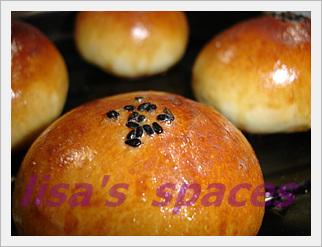 将发酵完成的面包胚上,涂上上光的蛋液,撒上黑芝麻之类的装饰,放入180度预热的烤箱烤15-18分钟即可。