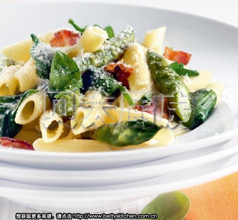 意大利通心面 300g, 芦笋 500g(去根,切段), 培根 150g(切小片), 小菠菜叶 200g, 帕玛森奶酪粉 120g, 白胡椒粉,盐 各1/3茶匙(2g)