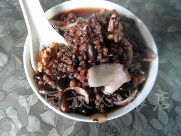 一人分:黑米2汤匙,甜百合10片左右,黑豆1汤匙,黑芝麻1把,大米1把,小薏米1把,碎核桃仁1小勺,红糖1小勺,水适量