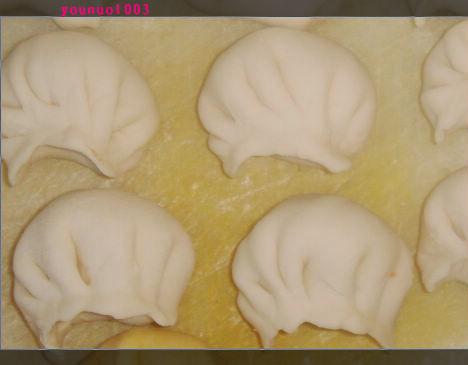 3。擀成饺子皮后,包上馅儿,包成如图的饺子形状。