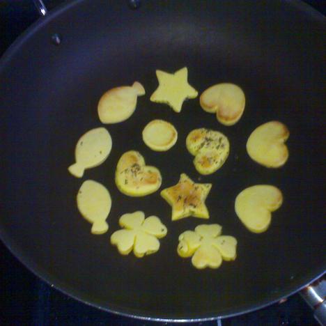 用模子压出可爱的形状,放到平底锅里,小火烤至两面成金黄色即可,放凉食用