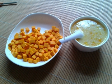 做法:南瓜去皮切块,小米洗净后用水浸泡20分钟;准备半瓶开水,倒入电饭锅中,下小米煮30分钟;煮小米时,用搅拌机将南瓜打成泥(省略也行)。30分钟后,加入南瓜同煮,继续煮15分钟即可,中间要时时搅一搅,避免粘锅。