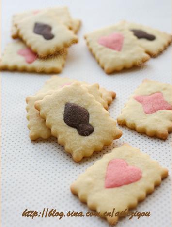 2、心形饼干同样是用170度烤10分钟左右,表面上色即可。把有窟窿的心放在整个的心上,在窟窿里挤满已经隔水加热的巧克力,巧克力凝固后两块饼干也就固定在一起了。