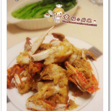 3、另起一锅倒入少许的油,下入切好的蒜末,姜末爆香后倒入炸好的螃蟹,倒入1勺料酒,加入2小勺蒸鱼豉油、1小勺糖。