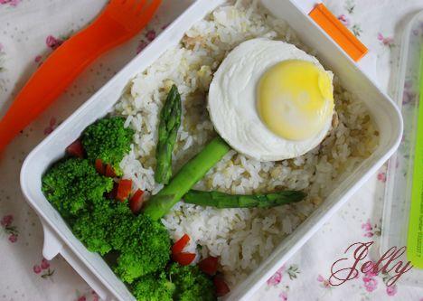 4、在饭盒的一端先铺上西兰花,然后在其余地方填满米饭,再将太阳蛋放在米饭上,作为花朵,芦笋切成适合的长度作为枝叶,摆出造型。