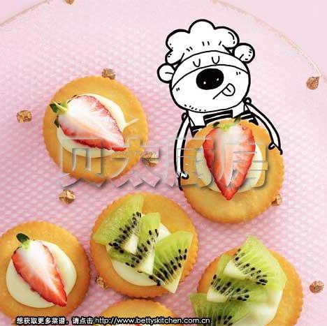 2、将优酪乳酱,涂抹在饼干上。水果切片,粘于饼干上即可。