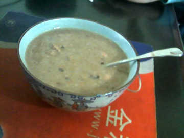 主料:大米50g,紫米50g,糯米10g,花生15g,玉米片100g,核桃仁10g,栗子10g,莲子10g,枸杞10g,黄芪5g,