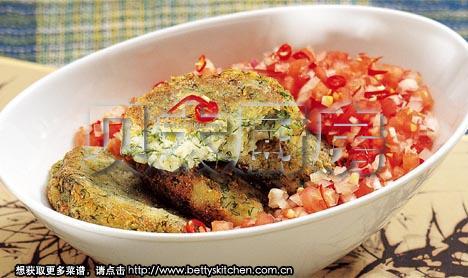 将西红柿、红皮洋葱和朝天椒剁成细茸状,调入盐拌匀。即可装盘,配在煎好的洋芋茴香粑粑旁。