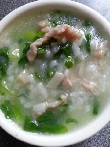 嫩里脊肉100克,粳米100克,姜末、精盐、味精、料酒各少许,植物油少量,清水适量。