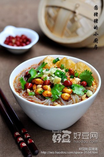 主料:红薯粉条150克,猪骨高汤1碗,干黄豆15克,花生15克,芽菜末10克,油豆泡4个 绿叶蔬菜2条,碎猪肉末50克(放在高汤内煮熟)