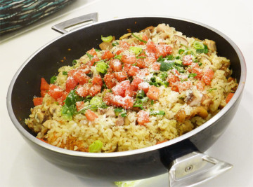8、焖熟后开锅盖,将切碎的青葱、番茄丁加入,并洒上起司粉、少取黑胡椒粉后就完成啰。