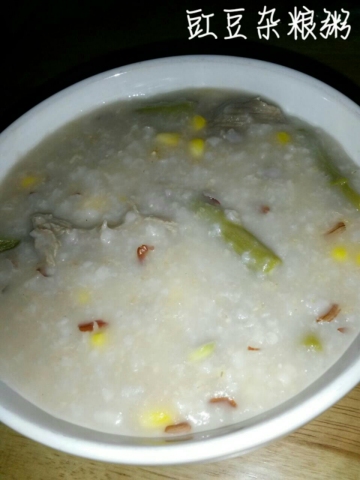 主料:十谷米150g,燕麦20g,猪肉200g,豇豆5条,姜1小块,粟米粒150g