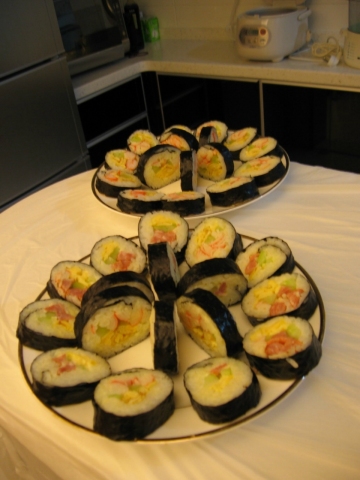 3,竹寿司卷放平,放上紫菜,放凉的米饭薄薄的铺在紫菜上,压实,在一边放上炒好的胡萝卜丝,青瓜丝,鸡蛋丝,火腿及腊肠丝,再将沙拉酱涂在上面。最后用竹制寿司卷将紫菜卷起并攥实,打开竹制寿司卷,将卷好的寿司切开一块一块,就完成了。
