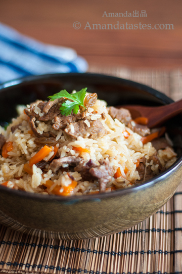 (2-3人份)原料:肥瘦相间的羊肉400g,胡萝卜2根约300g,中型洋葱半个,大米一杯半约225g,孜然粉一小勺,料酒一大勺,葡萄干一把约30g,盐适量,开水约350ml