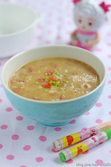 4.把鸡肝泥和番茄丁加入煮好的米粥中,再滚煮1分钟,加盐和油搅匀就可以了。