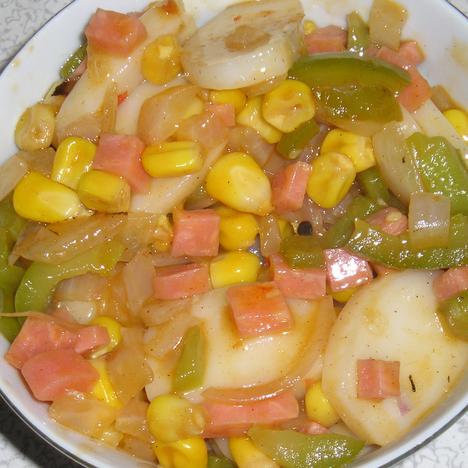 1、玉米粒过水煮熟,圆青椒洋葱火腿切丁。