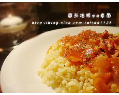 材料:字母意大利面,番茄,培根,洋葱,欧芹末,红酒,黑胡椒