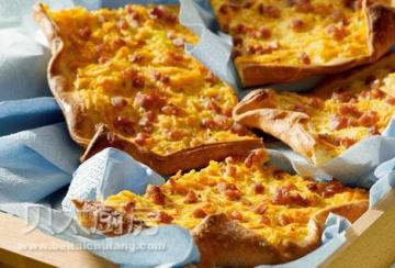 青豆用开水烫熟,和胡萝卜碎、洋葱碎、培根碎(50g)一起混合均匀,再撒在面饼上。