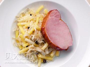 德式酸菜用料:卷心菜500g,洋葱50g(切丝),苹果50g(切丝),橄榄油2汤匙(30ml),白醋80ml,培根25g(切小丁),烟熏火腿4片(每片约120g),鸡汤50ml,香叶3片,丁香5枚,盐1茶匙(5g),白胡椒粉1/3茶匙(2g),通心面用料:意大利通心面300g,淡奶油180ml